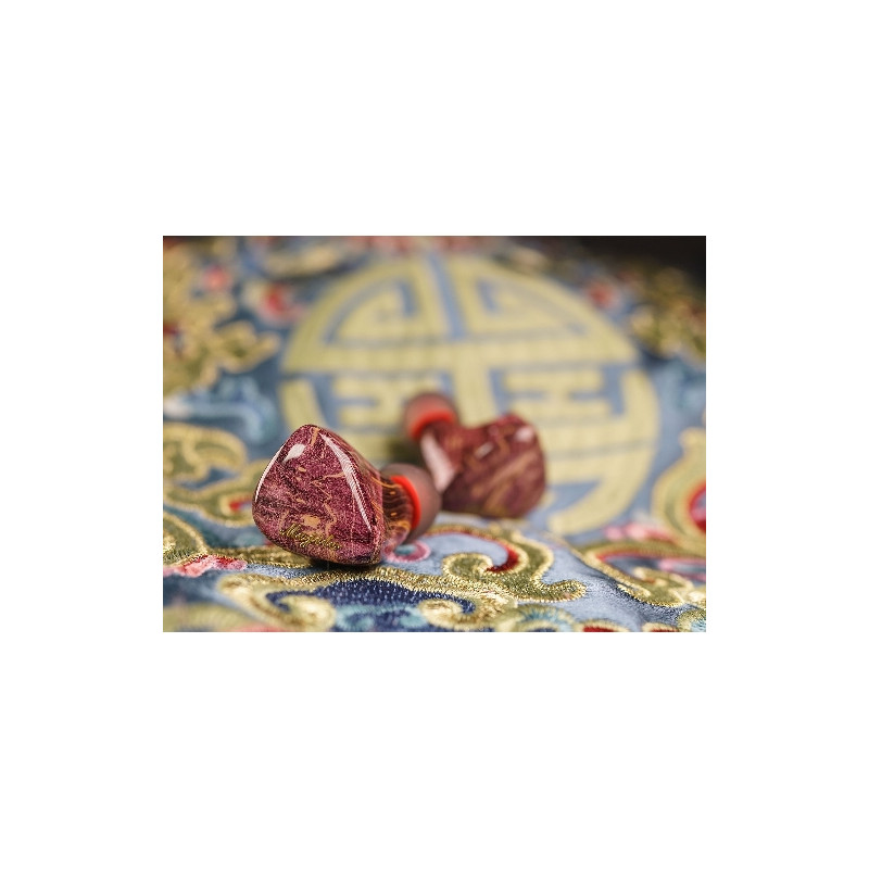 Słuchawki douszne z sześcioma przetwornikami BA w drewnianej obudowie.