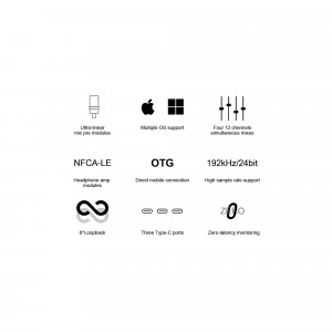 Topping Professional E1x2 OTG wykorzystuje doskonały interfejs USB XMOS, kompatybilny w szczególności z systemami operacyjnymi Windows, Mac, iOS i Android. Obsługuje strumienie audio o wysokiej rozdzielczości do nagrywania i odtwarzania, do PCM 24bit 192kHz.