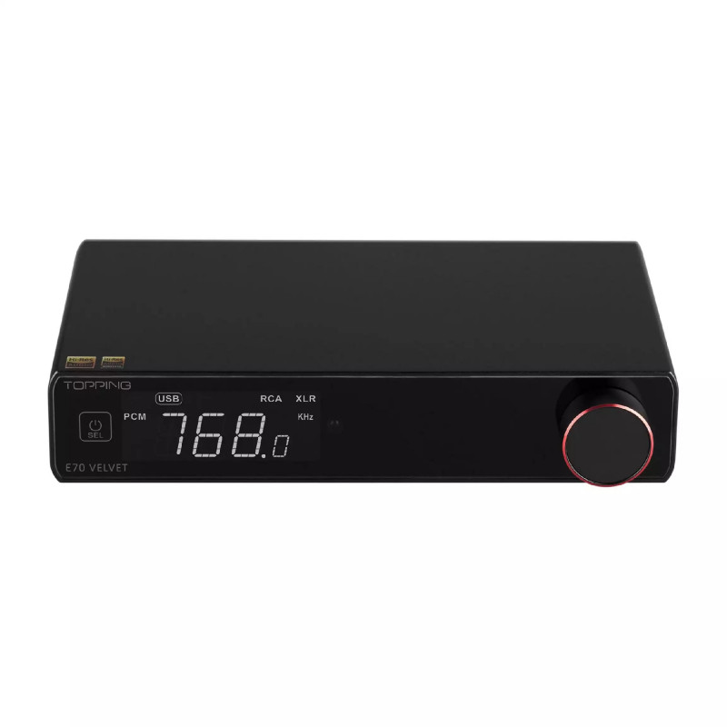 Wejście USB Topping E70 Velvet jest powiązane z najnowszą generacją interfejsu XMOS XU316, z niestandardowym sterownikiem Thesycon. Ten potężny interfejs obsługuje strumienie audio o wysokiej rozdzielczości, do PCM 32bit 768kHz i DSD512, zapewniając bardzo wysoką jakość odsłuchu.