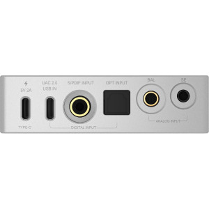 Unikalnym elementem są wejścia analogowe: 3,5 mm (1 Vrms) i 4,4 mm (2 Vrms), umożliwiające podłączenie źródeł analogowych, np. gramofonu (z preampem) lub przedwzmacniacza mikrofonowego. Wejścia te pozwalają również na nagrywanie – sygnał jest konwertowany do 48 kHz/24‑bit i przesyłany przez USB do komputera lub smartfona, z możliwością monitoringu w czasie rzeczywistym.